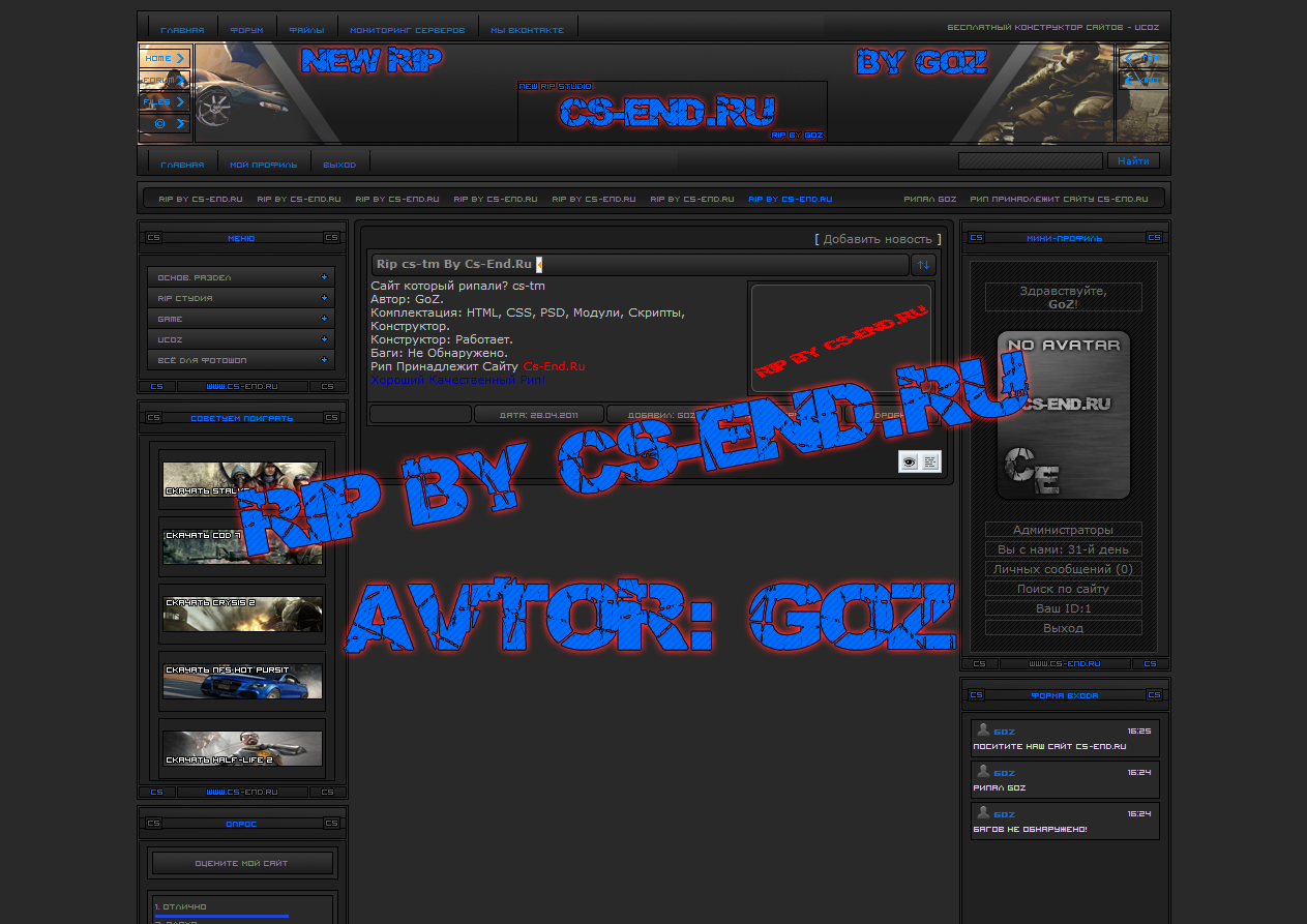 Сайт который рипали? Up-Zone.Ru Автор: GoZ. Комплектация: HTML, CSS, PSD, Скрипты. Конструктор: Работает. Баги: Не Обнаружено. Рип Принадлежит Сайту Cs-End.Ru